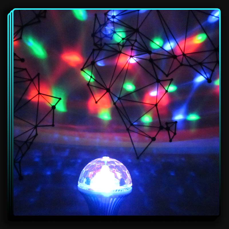 داری سه LED SMD قرمز سبز و آبی هر کدام یک وات . دارای موتور برای چرخش حباب رقص نور . 20000 ساعت عمر مفید . قابل نصب در سرپیچ معمولی (E27) به صورت آویز و دیواری.